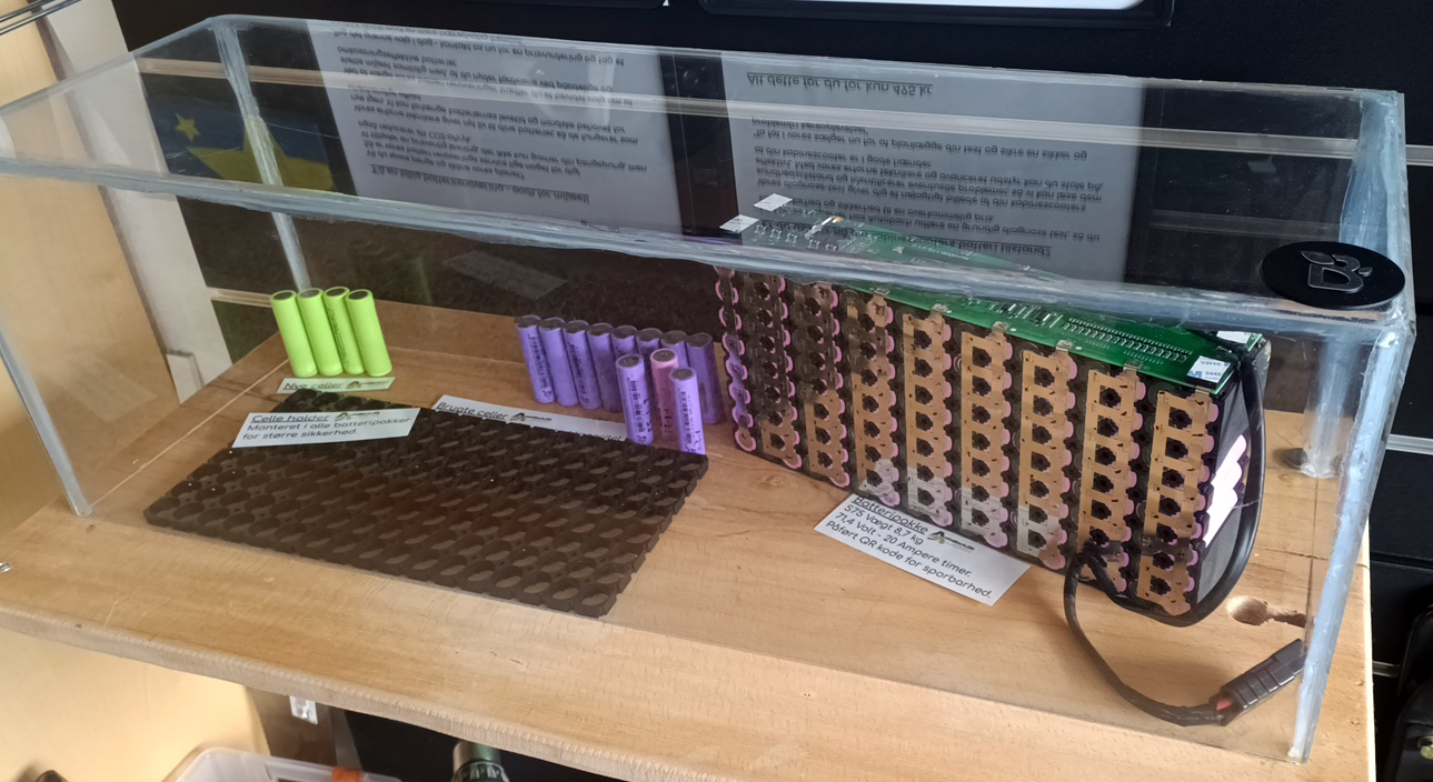 På billedet ser du en åben batteri pakke fra vores udstilling i Hobro. Den populære S batteri pakke som blev udviklet i 2016 til BACH kabinescootere og er blevet opdateret løbene i takt med udviklingen af cellerne er blevet bedre og kan yde mere.
