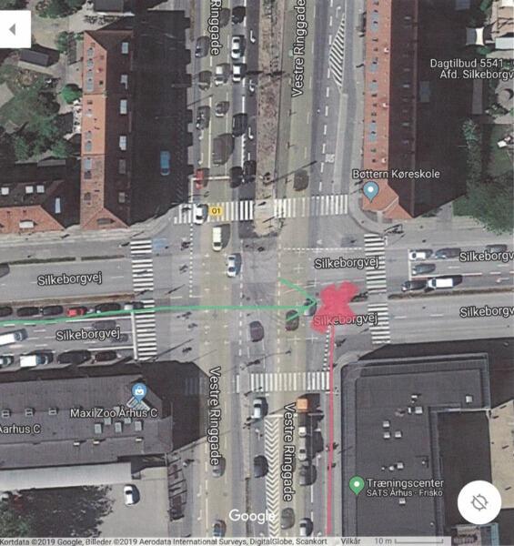 I dette gadekryds, i Aarhus, hvor bilen kørte over for rødt og stødte sammen med kabinescooteren, som hurtigt var ude i krydset, da det blev grønt for cyklister, lidt før det blev grønt for bilerne.